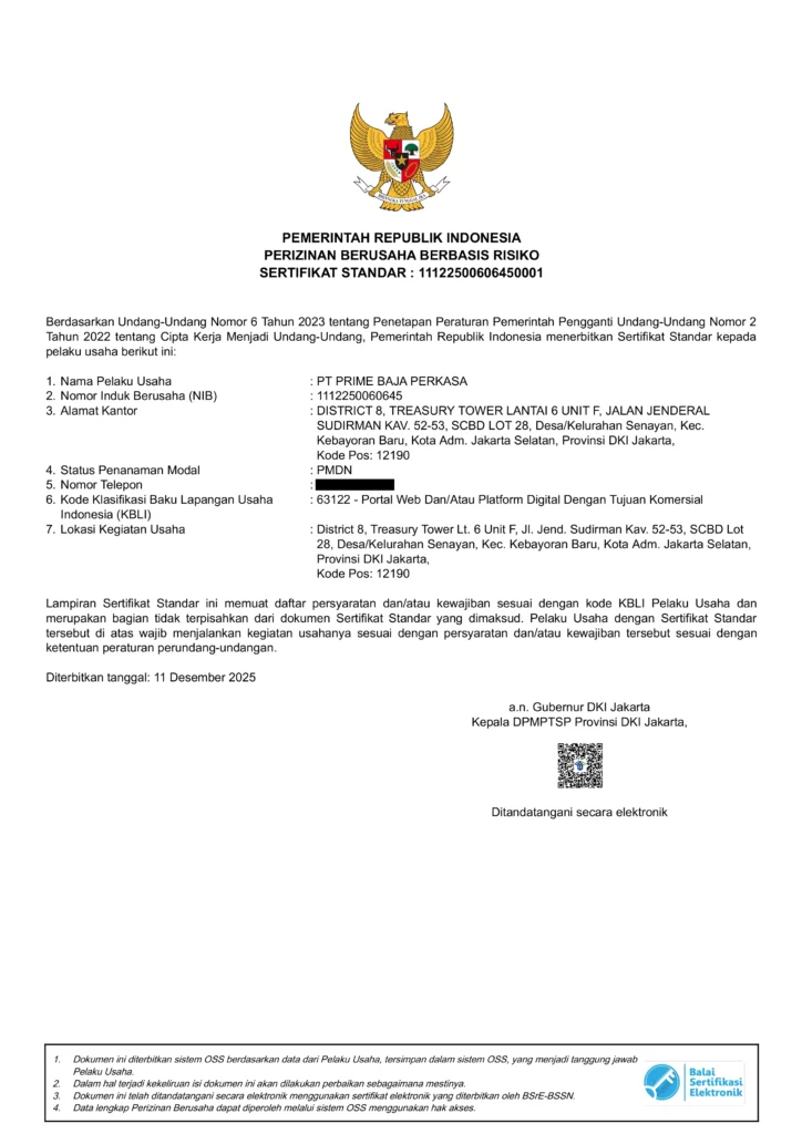 PT Prime Baja Perkasa telah memiliki Perizinan Berusaha Berbasis Risiko dan Sertifikat Standar yang diterbitkan melalui sistem OSS Pemerintah Republik Indonesia. Legalitas ini memastikan kegiatan usaha dijalankan sesuai ketentuan peraturan perundang-undangan yang berlaku.